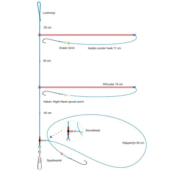 De Midnight Moon Platvis Onderlijn met Swivelbead is voorzien van twee rode, 15 cm lange kunststof afhouders met daaronder een sleeplijn. De haaklijnen zijn voorzien van Night Hawk haken met attractieve kralen.