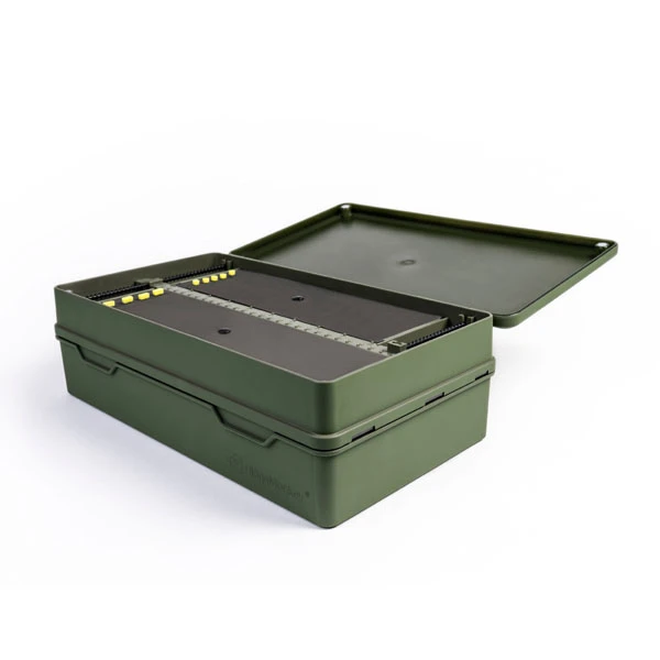 De Armoury Tacklebox van RidgeMonkey is een zeer compleet opbergsysteem waar u met gemak al uw klein materiaal en onderlijnen in kunt opbergen. De Armoury Tacklebox is voorzien van magnetische sluitingen en kan tegen een stootje dankzij het gebruik van ABS en polypropyleen. De tacklebox is voorzien van 29 afsluitbare compartimenten en drie rig boards inclusief 45 enkele en 30 dubbele rig pins.