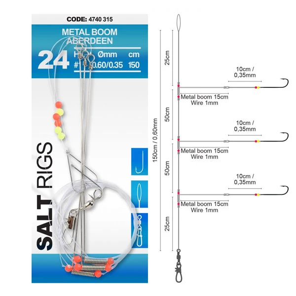 De Metal Boom Aberdeen – Salt Rig 24 van Spro is voorzien van drie metalen afhouders met een lengte van 15 cm. De haaklijnen zijn voorzien van sterke Aberdeen haken en attractieve kralen. De Metal Boom Aberdeen – Salt Rigs 24 hebben een lengte van 150 cm.